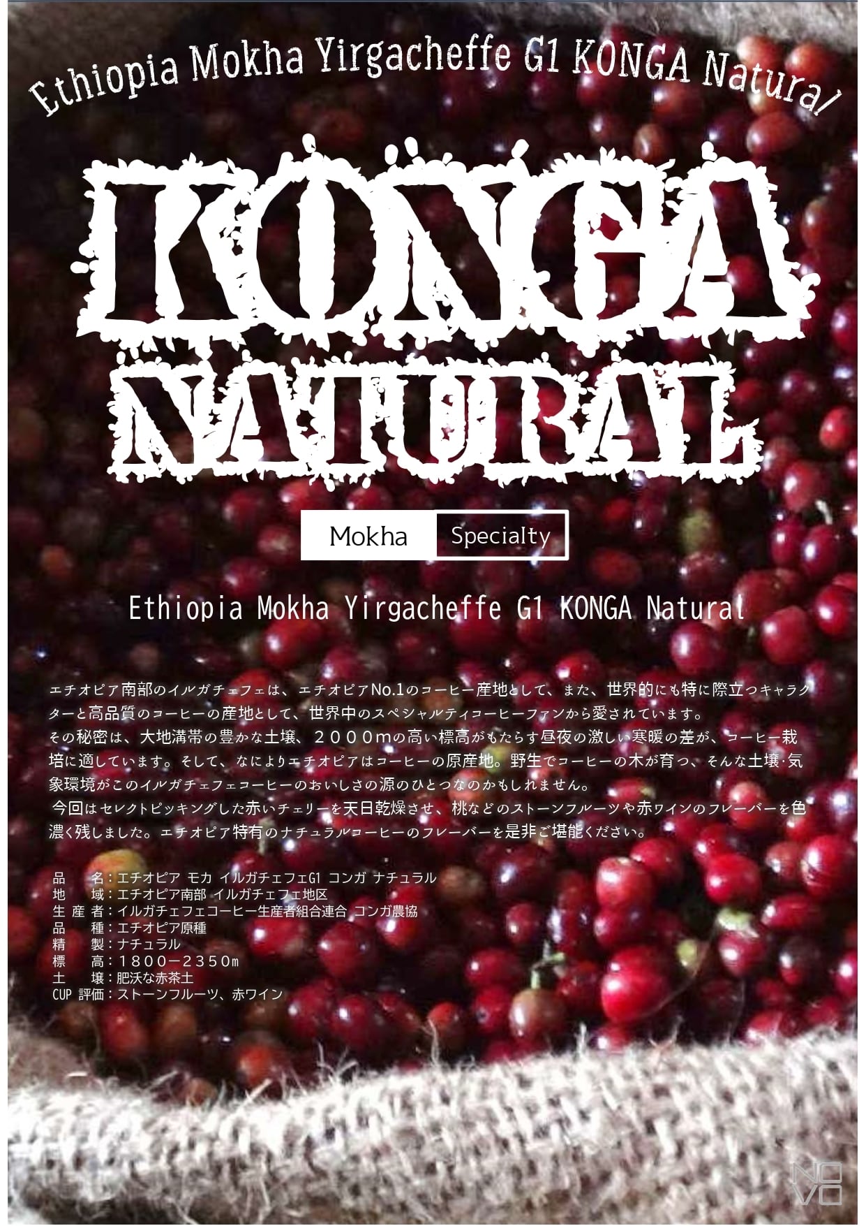 今回はセレクトピッキングした赤いチェリーを天日乾燥させ、桃などのストーンフルーツや赤ワインのフレーバーを色濃く残しました。エチオピア特有のナチュラルコーヒーのフレーバーを是非ご堪能ください。
