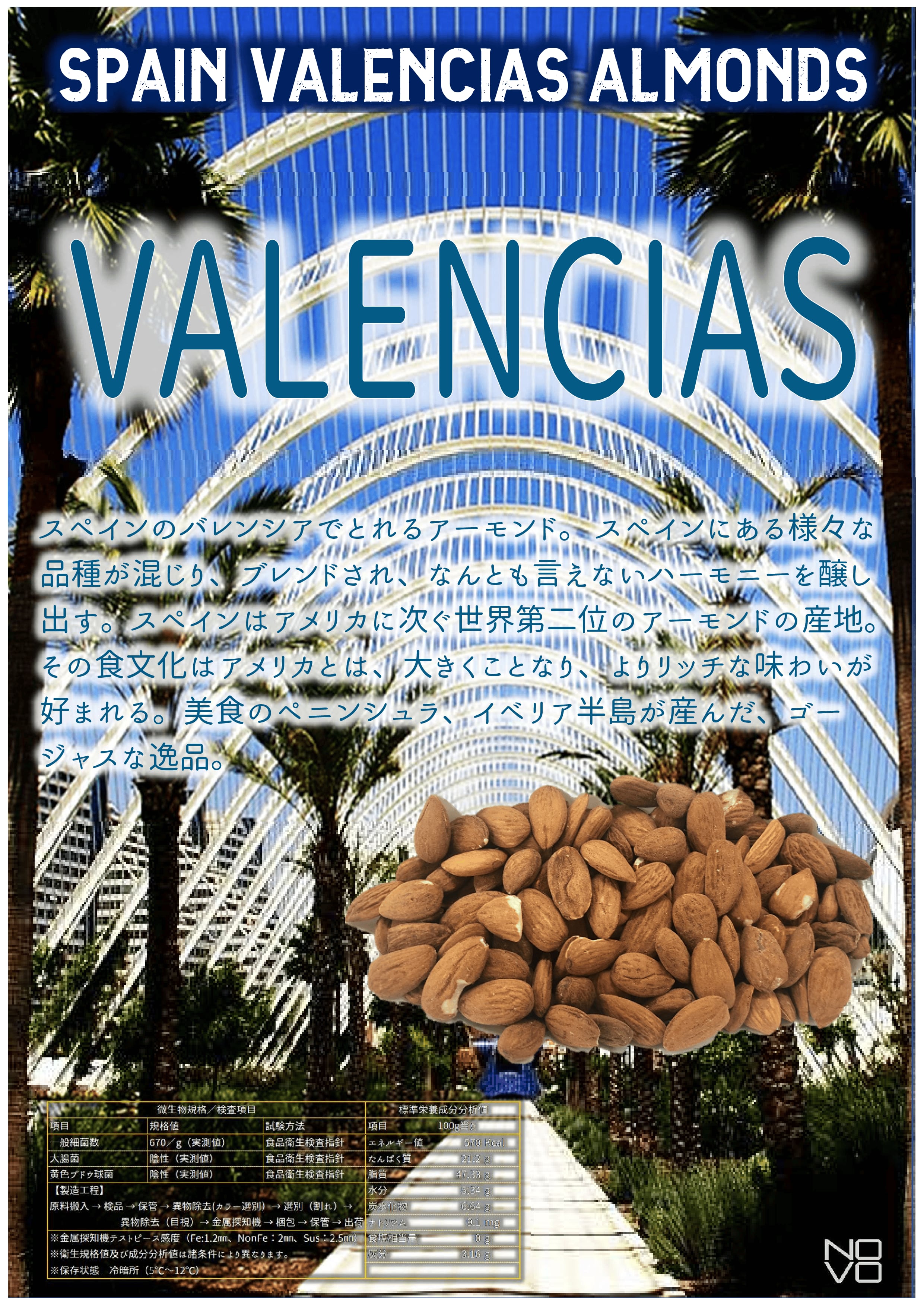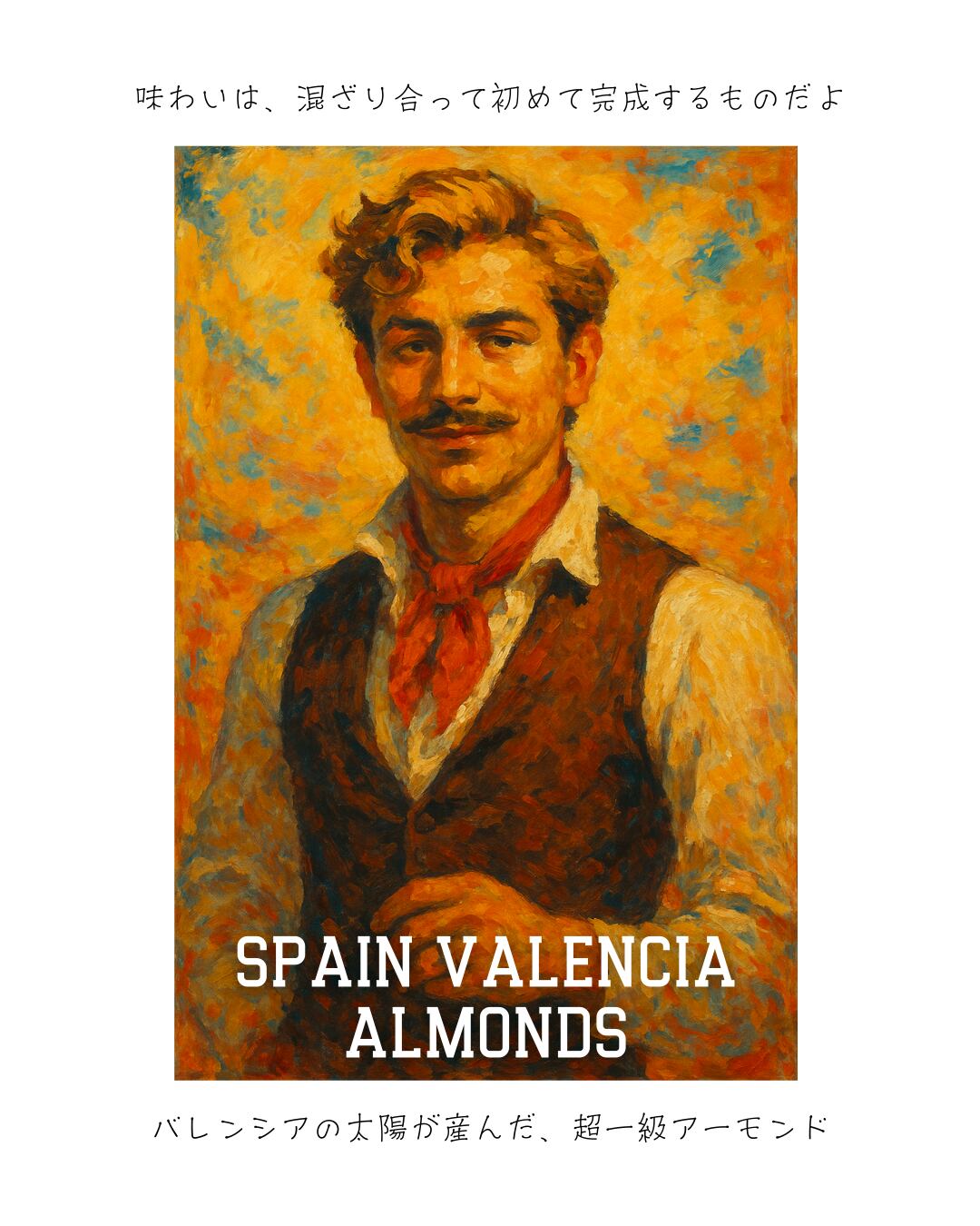 スペインのバレンシアでとれるアーモンドは、様々な品種が混じり、ブレンドされ、なんとも言えないハーモニーを醸し出します。スペインは、アメリカに次ぐ世界第二位のアーモンドの産地であり、よりリッチな味わいが好まれる食文化が特長です。